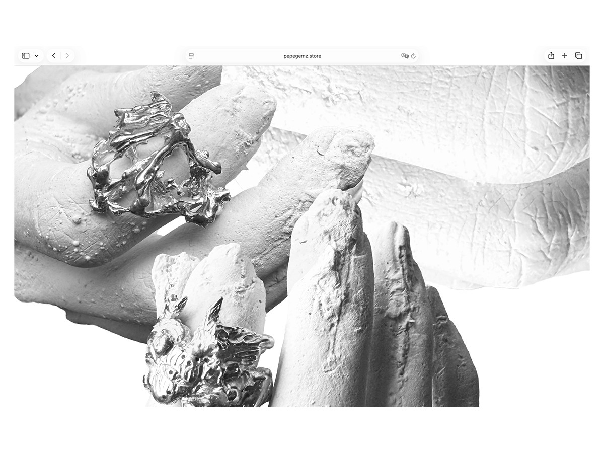 I wanted to give the website a more personalized touch by enabling visitors to virtually try on rings on a sculptural hand model. The website functions less as a product platform and more as an atmospheric extension of the brand.