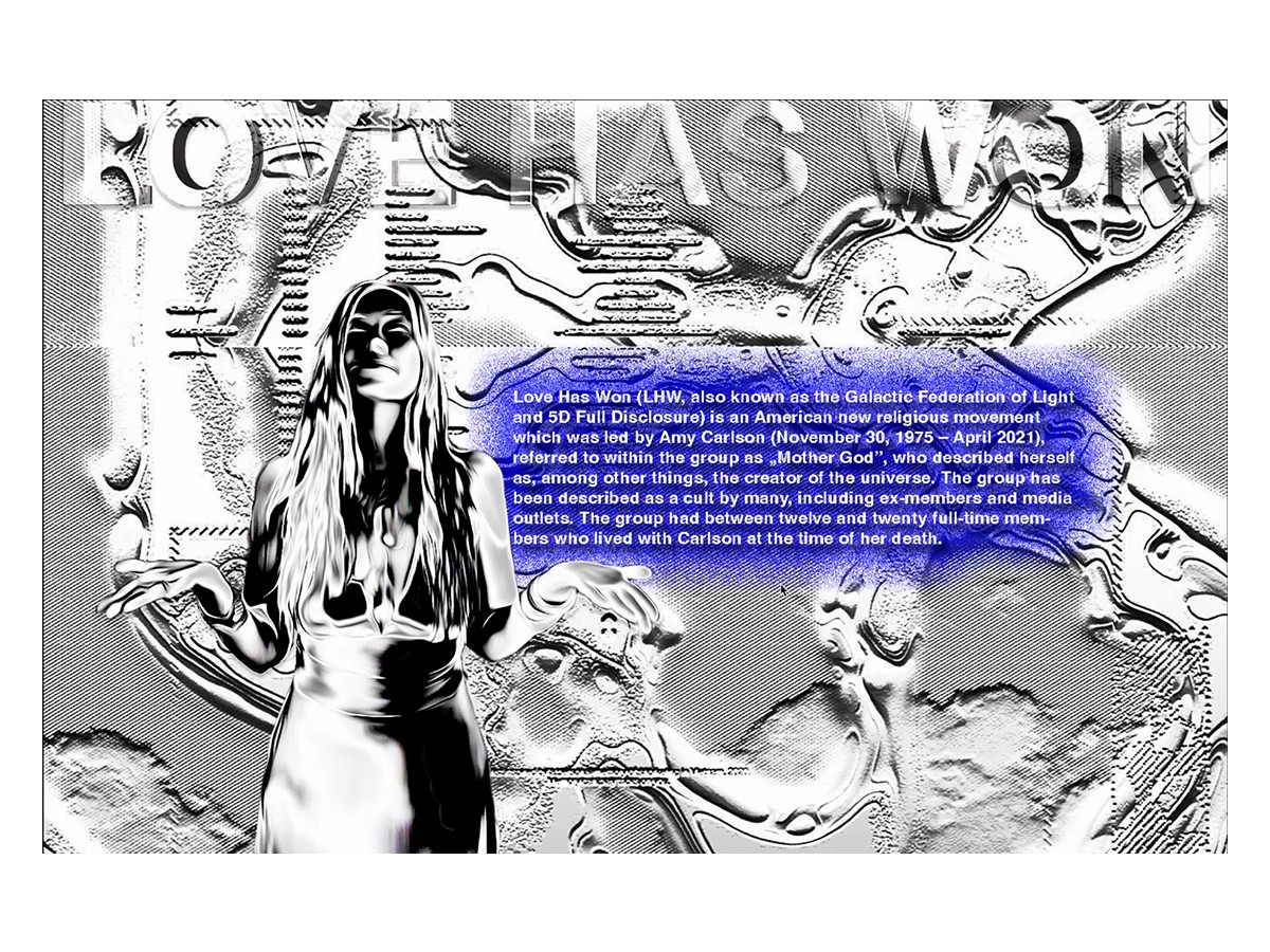 A responsive storytelling website exploring the Love Has Won cult, designed to mirror the surreal nature of their colloidal silver consumption and apocalyptic beliefs.